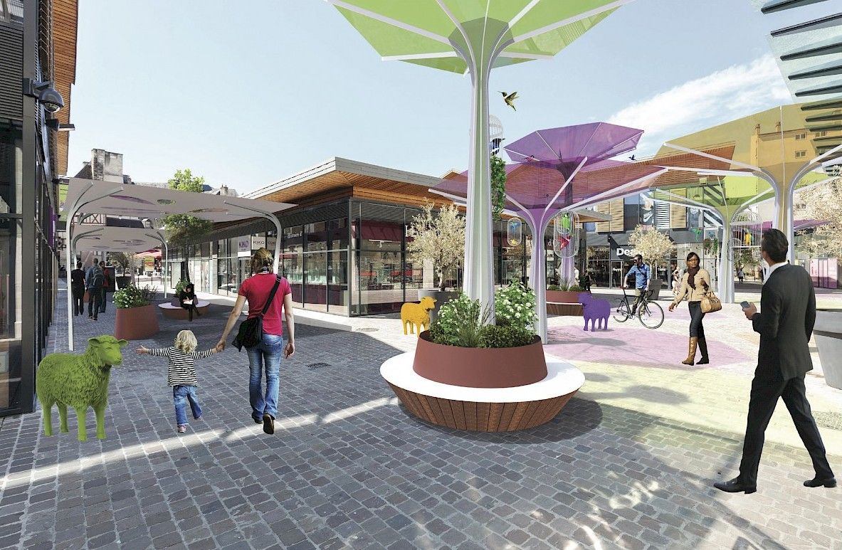 Notre mission est d’optimiser l’expérience shopping et d’ajouter un ensemble d’éléments couvrants et confortables pour faire de cette rue à l’air libre et prise au vent une promenade protégée et interactive.