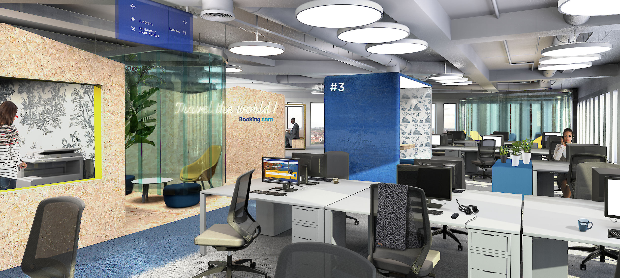 Pierre & Maurice a imaginé pour Coldefy & Associates Architectes (CAAU) un espace de travail à la fois inspirant et confortable pour la plateforme téléphonique du service de conciergerie en ligne Booking, basée à Tourcoing (Hauts-de-France - 59).