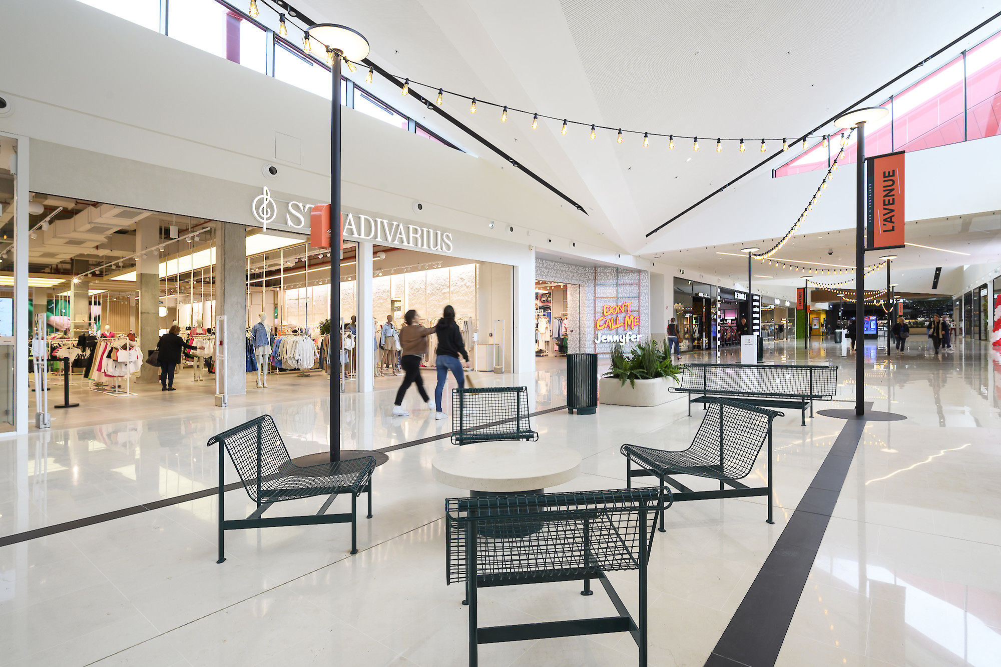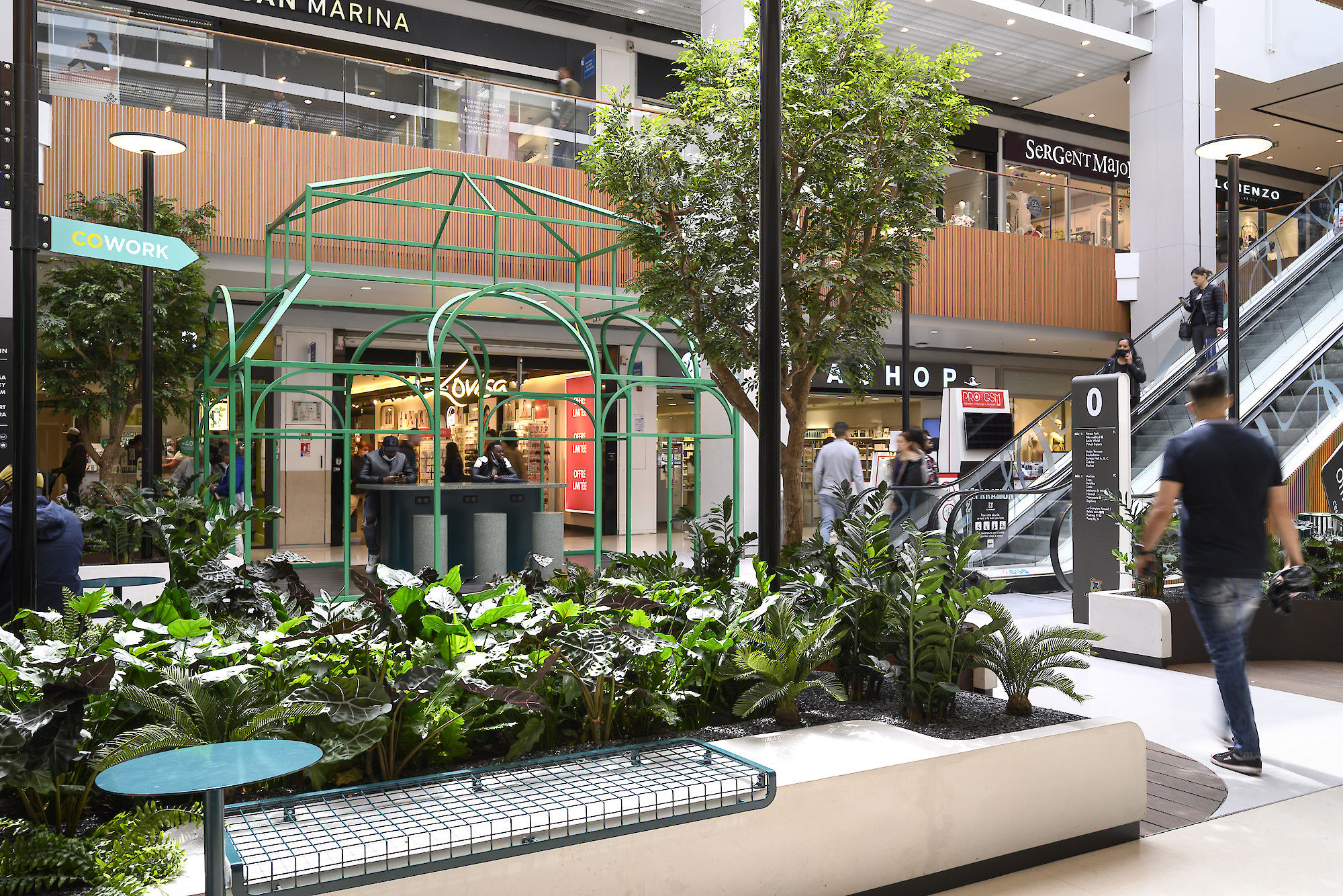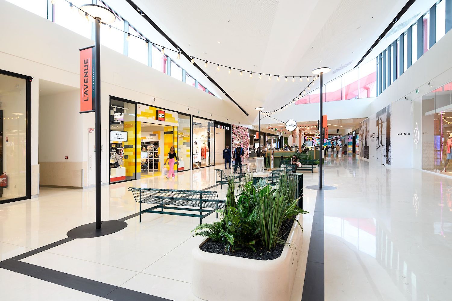 Nous travaillons à rythmer et surprendre, susciter l'envie de découvrir les autres espaces. Nous mettons en place un fil rouge mobilier et identitaire pour créer le liant entre toutes les parties du centre : extérieur / intérieur / extension. Nous apportons lisibilité, circulation, optimisation signalétique.