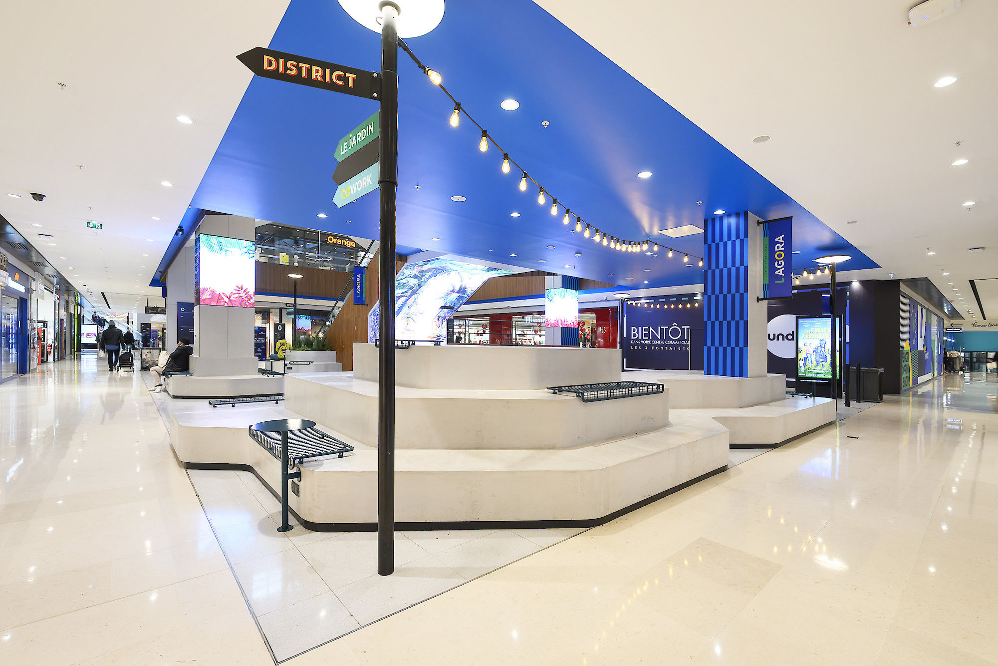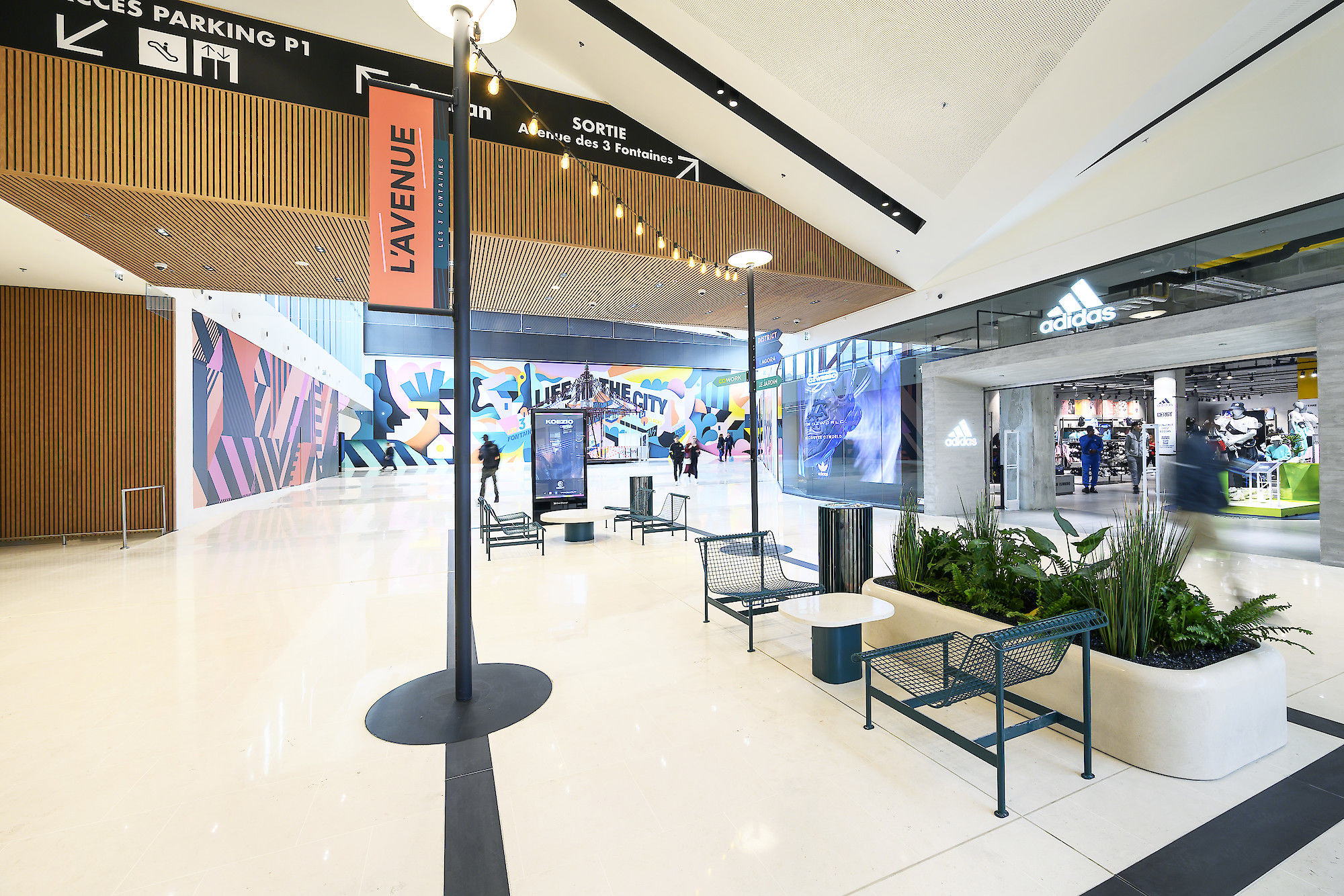 Véritable coeur du projet, le centre commercial des 3 Fontaines, propriété du groupe Hammerson, fait l’objet depuis plusieurs années de vagues successives de rénovations. Après des travaux à l’intérieur en 2015-2016, le chantier de l’extension, qui comprend la reconstruction des parkings et la création de 16.000 mètres carrés de surface de vente supplémentaires (soit 72 boutiques), a démarré en avril dernier. Un pôle de restauration, le District ouvert 7 jours sur 7 est créé en 2020 et le supermarché Auchan est rénové.