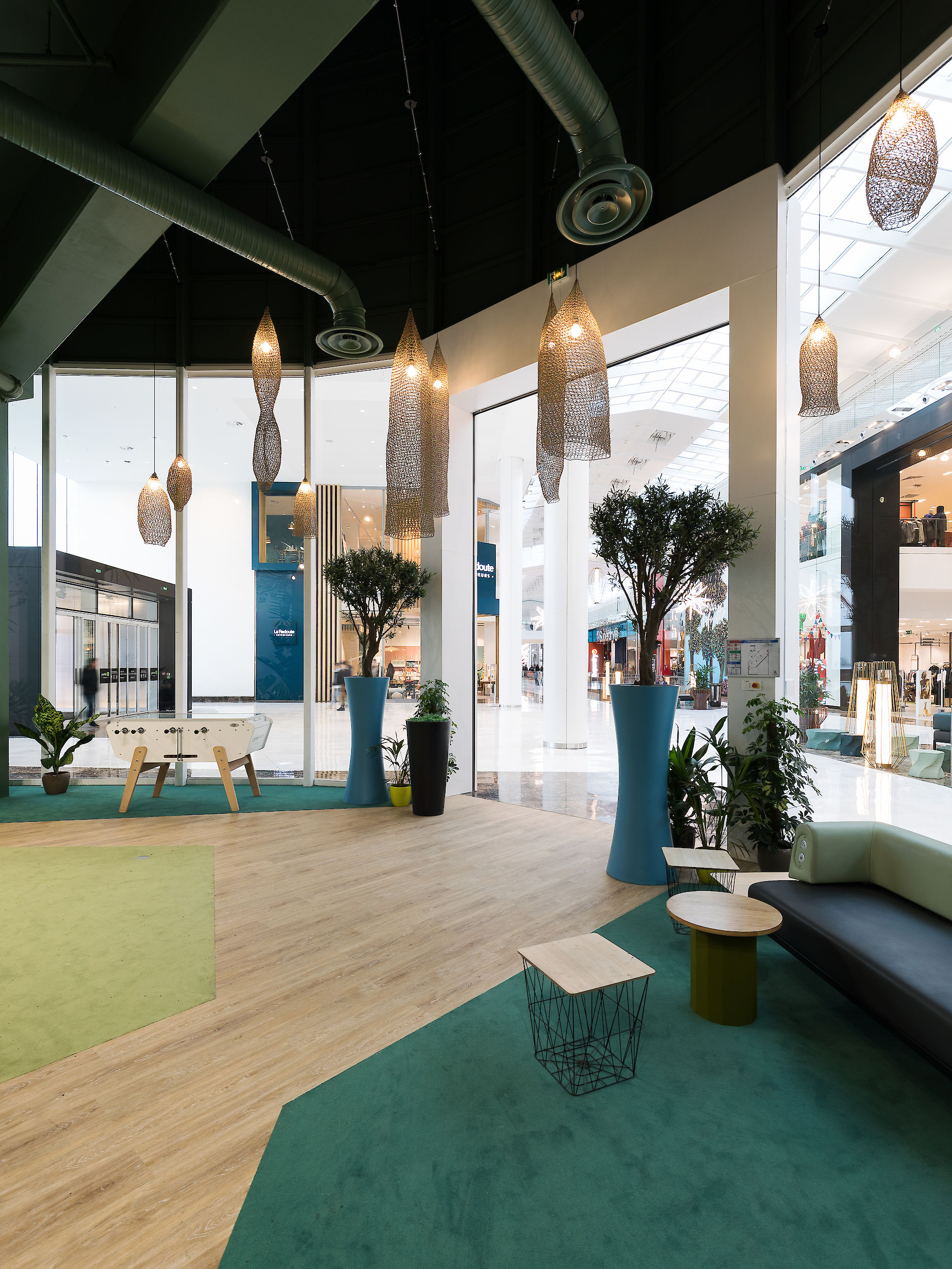 Nous avons conçu le Jardin d'Hiver et le Jardin d'Eté. Le jardin d'Hiver est un Lounge destiné aux visiteurs et clients du centre commercial. Il permet de patienter tout en s'amusant ou en travaillant. C'est une réponse simple mais essentielle à l'exploitation d'un espace qui n'a pas encore trouvé preneur.
