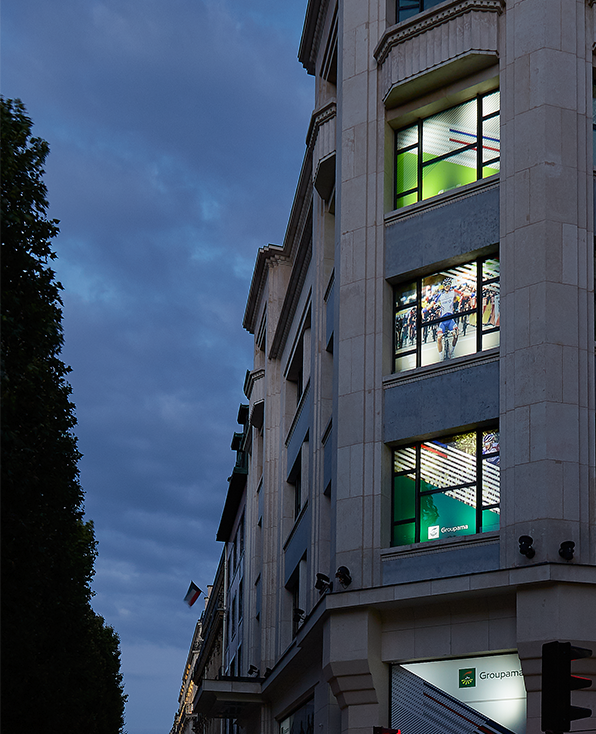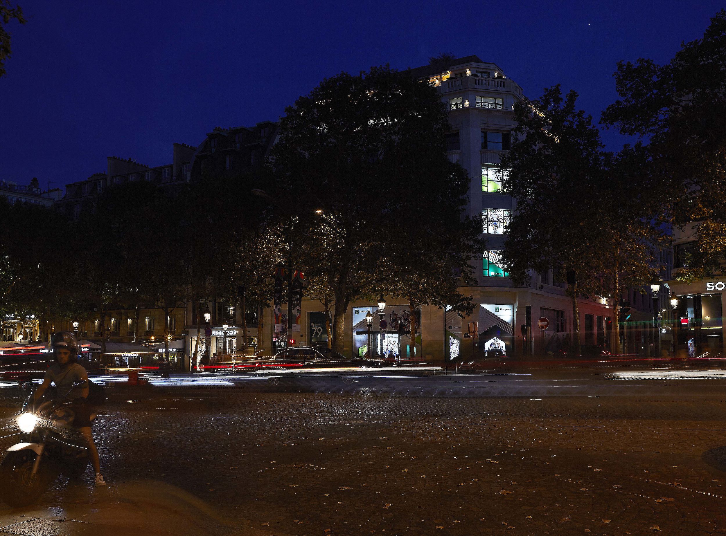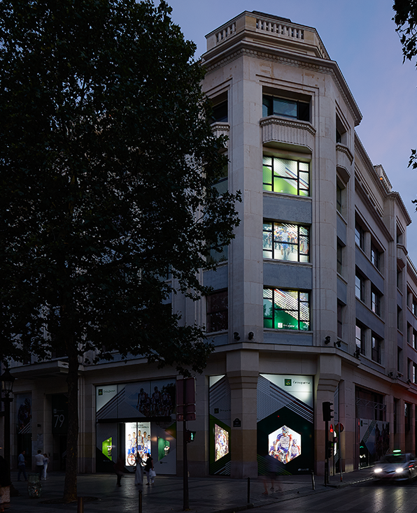 L’immeuble du 79 est parfaitement situé. Il est dirigé vers l’Arc de Triomphe, particulièrement visible par la hauteur des vitrines et leur linéaire. Durant les travaux, l’occasion d’exploiter cette surface est trop belle. Il s’agit pour Pierre & Maurice de définir un projet codifié, suivant la charte graphique existante. De jour comme de nuit, cette scénographie surprenante, créée par l’illusion d’une vitrophanie extérieure, est habillée par l’illustration des innovations sportives et des succès de l’équipe, celle-ci s’éclairant la nuit.