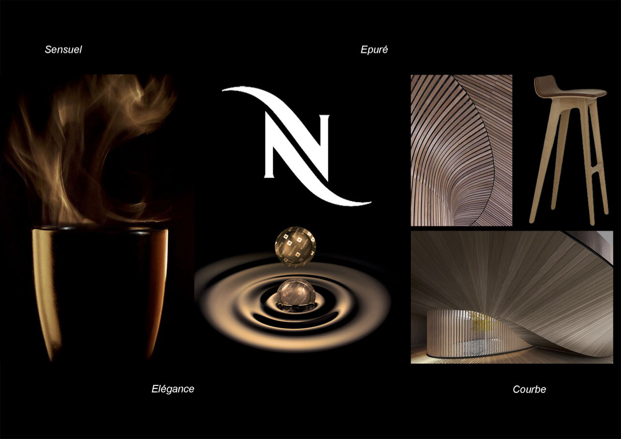 La marque est par bonheur constituée d’un nombre important de codes élégants. Nous avons retenu celui de la virgule qui constitue le N du logo Nespresso. Cette forme nous l’avons étendue mais reste identifiable. Puis, inspirés par les valeurs véhiculées par la marque et ses campagnes de publicité, nous avons proposé un vocabulaire à la hauteur de l’idée qu’on se fait d’une élégance Nespressionniste à la Française.