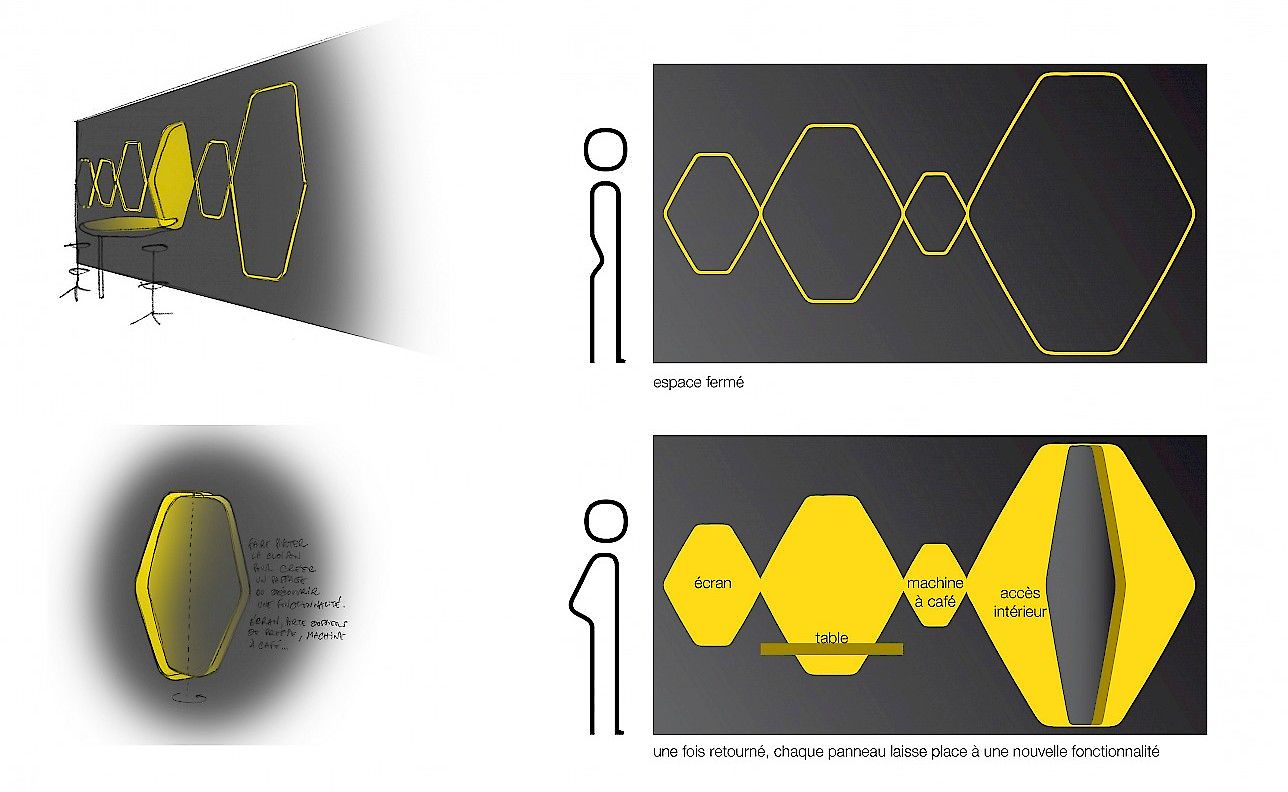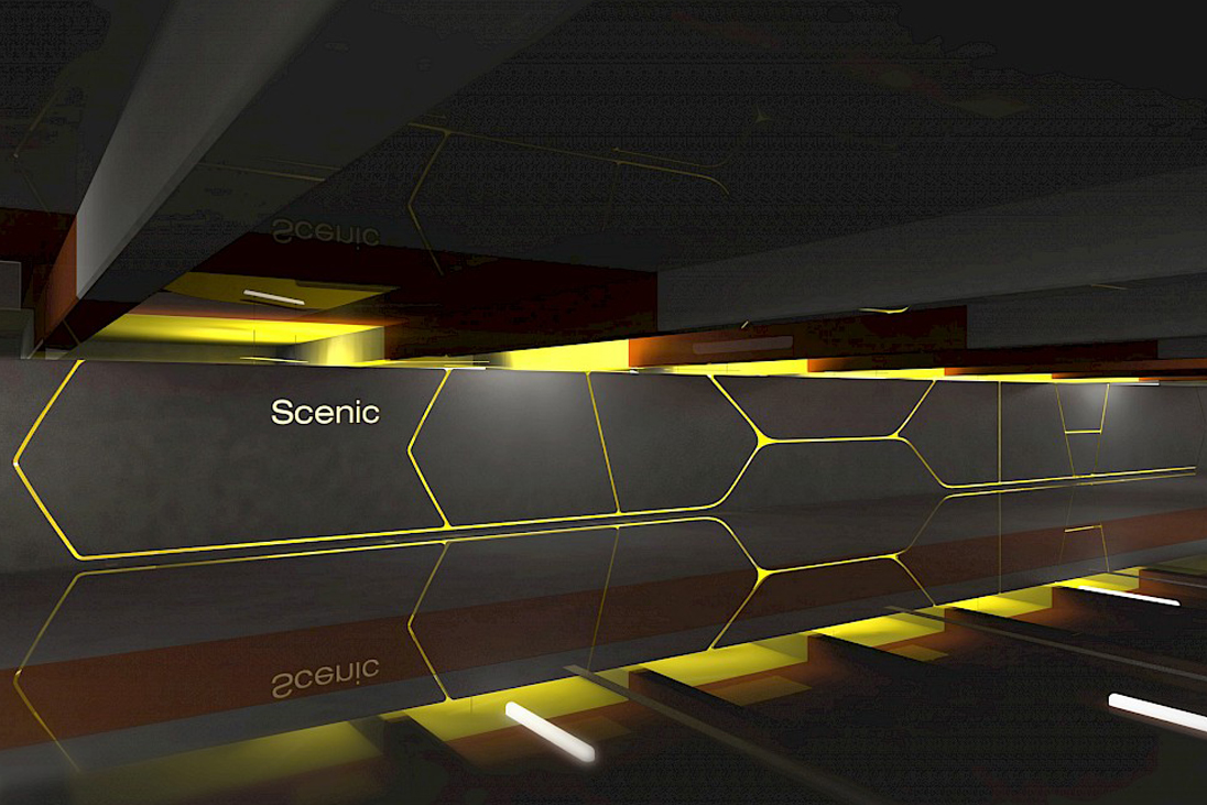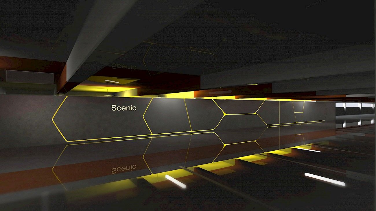 Commande d'Hopscotch : cette fois-ci c'est un parking qui accueille notre scéno pour une scénic. Jouant sur les contrastes, nous offrons de l'inattendu dans ces lieux lugubres et gras. Nous dévoilons progressivement le programme du client dans un écrin doré. Un jeu de cloisons pivotantes et de volets croisés mettent en lumière un espace scénique éblouissant !