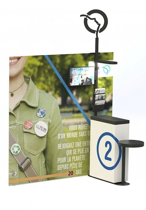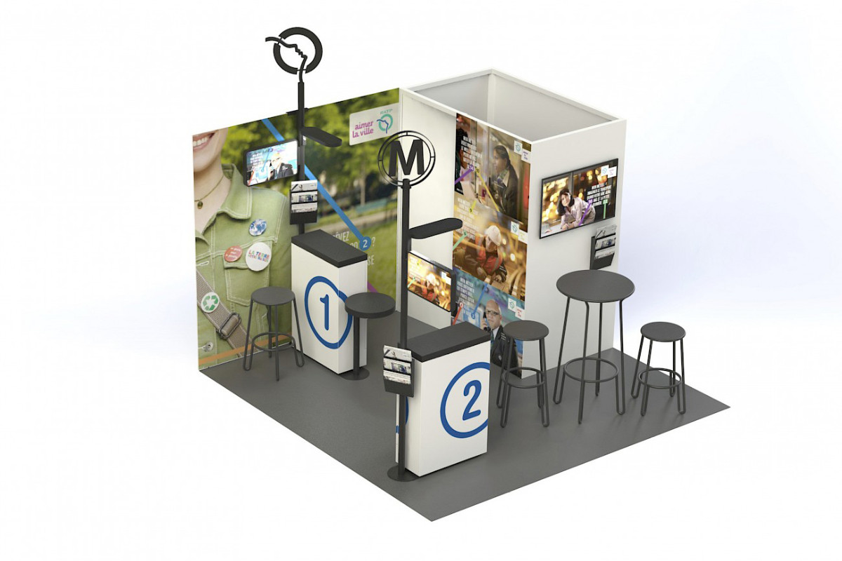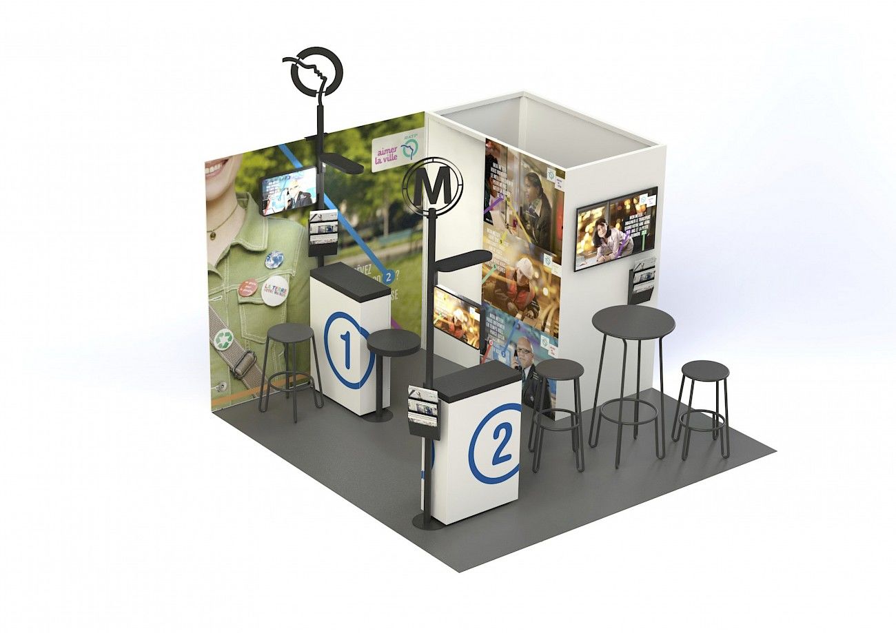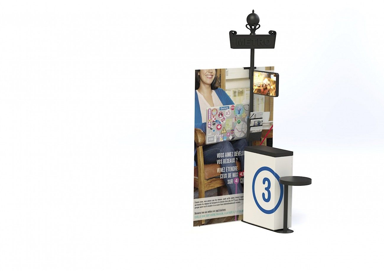 La mission : concevoir et produire un objet dédié aux campagnes de promotion RH de la maison RATP. L’objet se veut « design », facilement transportable, institutionnel, pratique, pas cher etc. Nous avons imaginé un objet qui puisse être monté par n’importe qui et qui instaure le respect. Il n’é–tait pas question pour nous de proposer un comptoir en tissu imprimé...