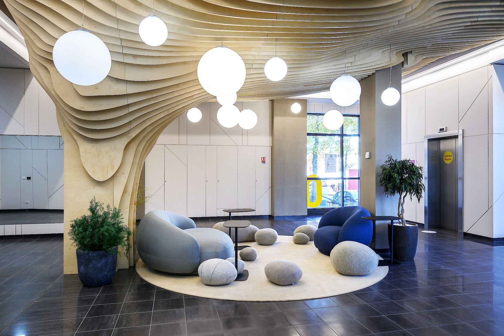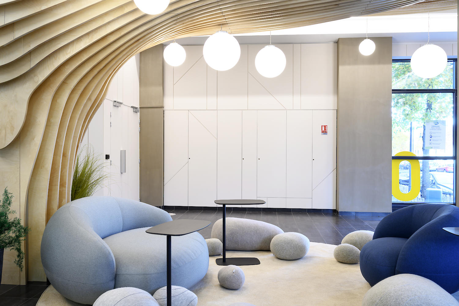 Ces deux lobbies, sans univers cohérent et tombant en désuétude ne correspondent plus à l’image et l’ambition qu’Icade souhaite instaurer au sein de son parc (multiplicité des services, base vie extérieure...). L'approche de Pierre & Maurice consite à transmettre par un geste ambitieux, offrir un nouveau message et ce dès l’entrée lequel permet le mixe de différents usages, accueillants, vivants et contemporain.