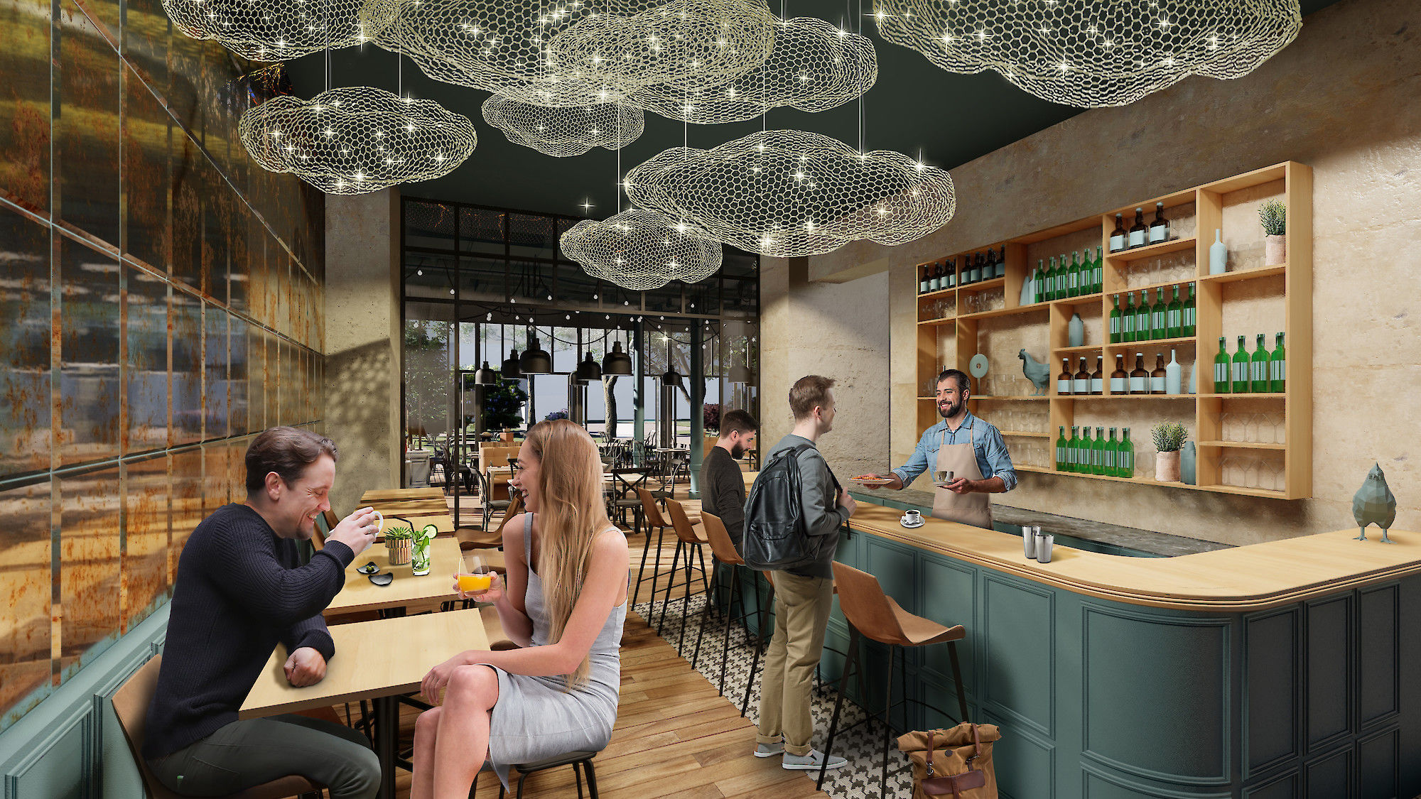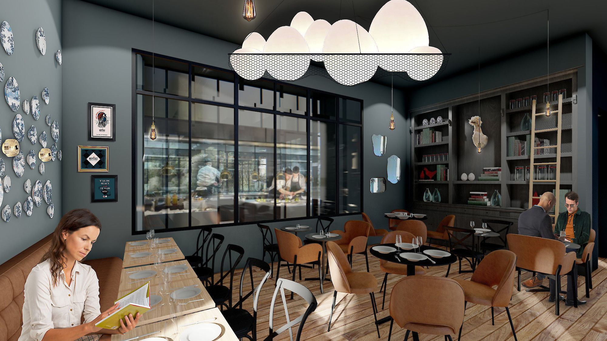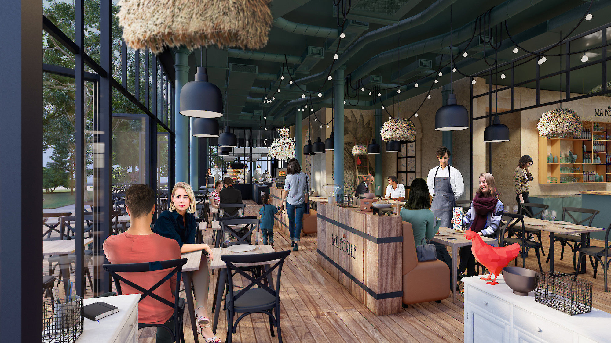 L'identité visuelle du concept intitial "'MA POULE" a été optimisée par DA.IAM et nous a offert un champ lexicale riche, un plaisir à déployer dans la décoration intérieure : pieds de poule, gros oeufs, Coq à crête, ballot de paille etc.
