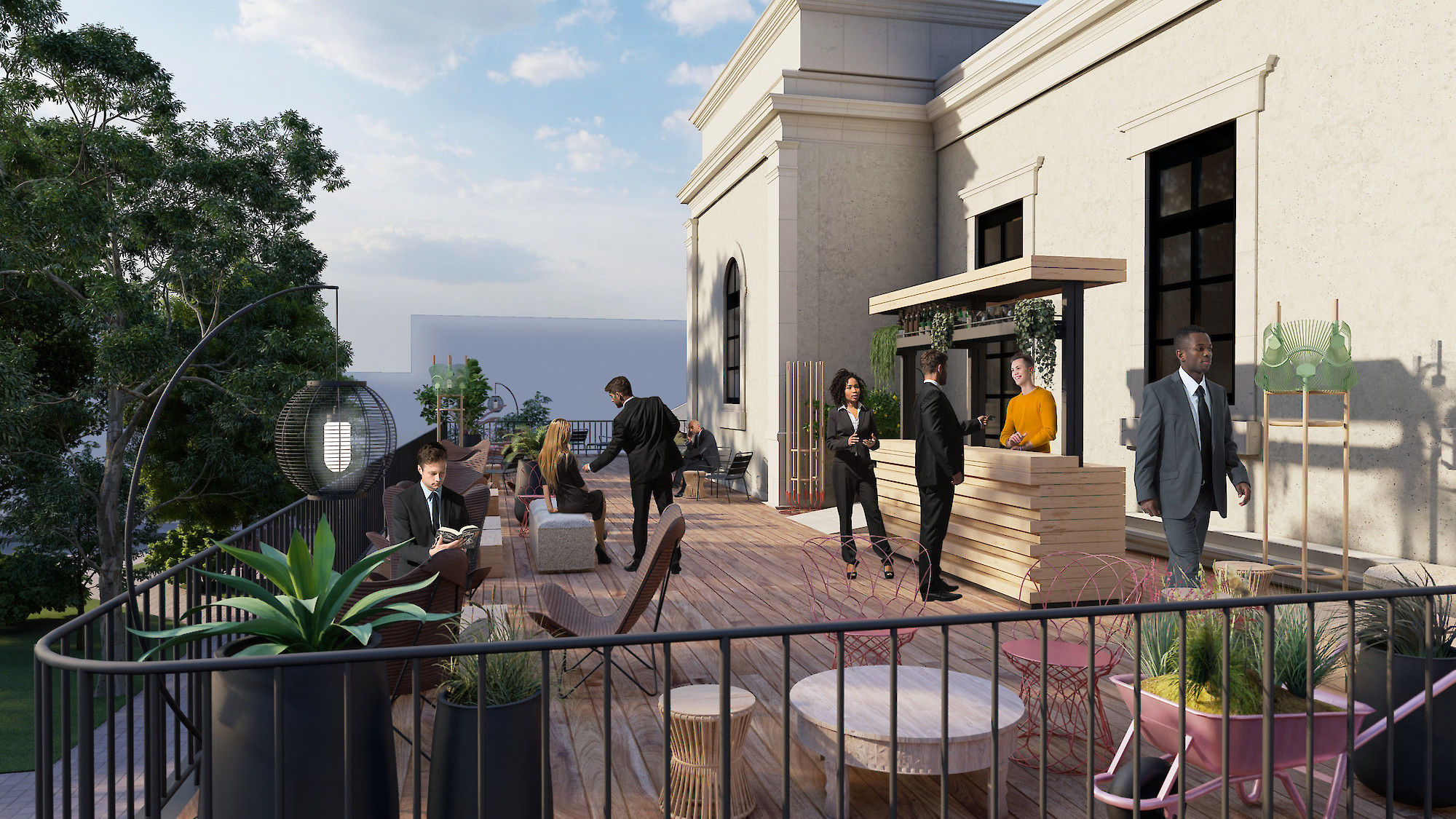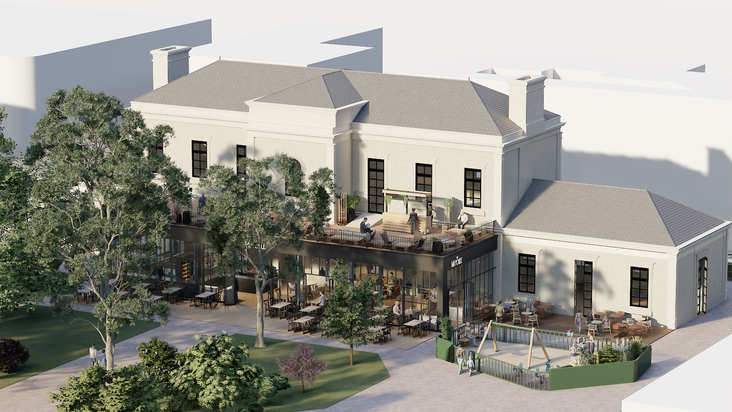 L'étage dédié aux évènements BtB ou aux cérémonies permet d'accèder à la terrasse, laquelle détient un acces PMR discrètement inscrit sur l'arrière de l'extention verrière.